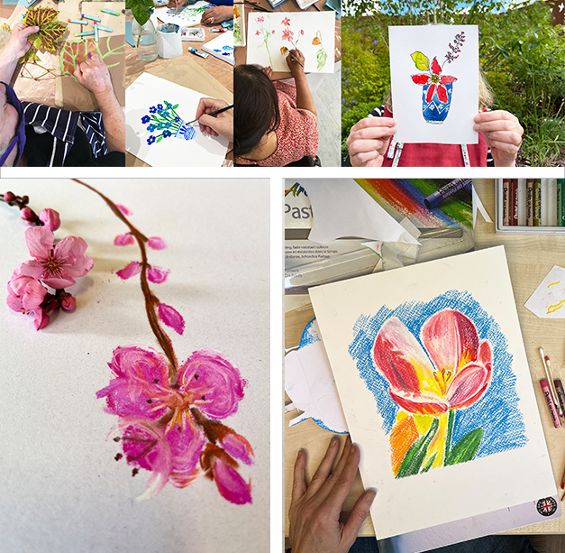 Over the 6 weeks I’ll guide you through using different drawing and painting media – anything from charcoal, watercolours, acrylics, chalk and oil pastels – and playing with what happens when we mix them up. We also use past and present artists as inspiration alongside samples of my own work. With our focus on enjoying the creative process, we’ll observe plant and flower life from Winterbourne Gardens, learning new techniques, developing skills and enjoying the calming benefits of art-making.
