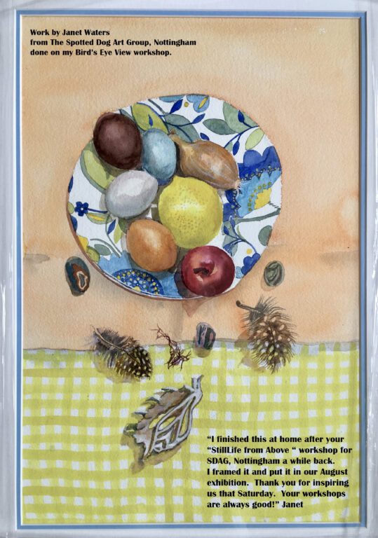 Past class – ‘Bird’s Eye View is new way to see still life…literally’ for The Spotted Dog Art Group, Nottingham, June 2025
