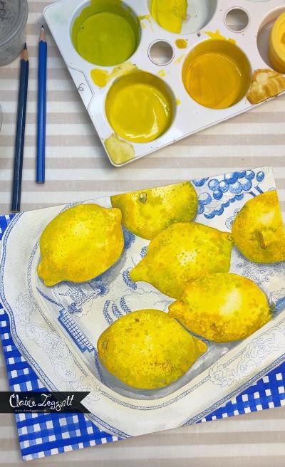 14 January 2025Starting a fresh New Year with a fresh new painting – Lemons on a Plate. A watercolour gouache (with a little bit of pencil work) full of lovely bright colour to cheer us up until springtime.