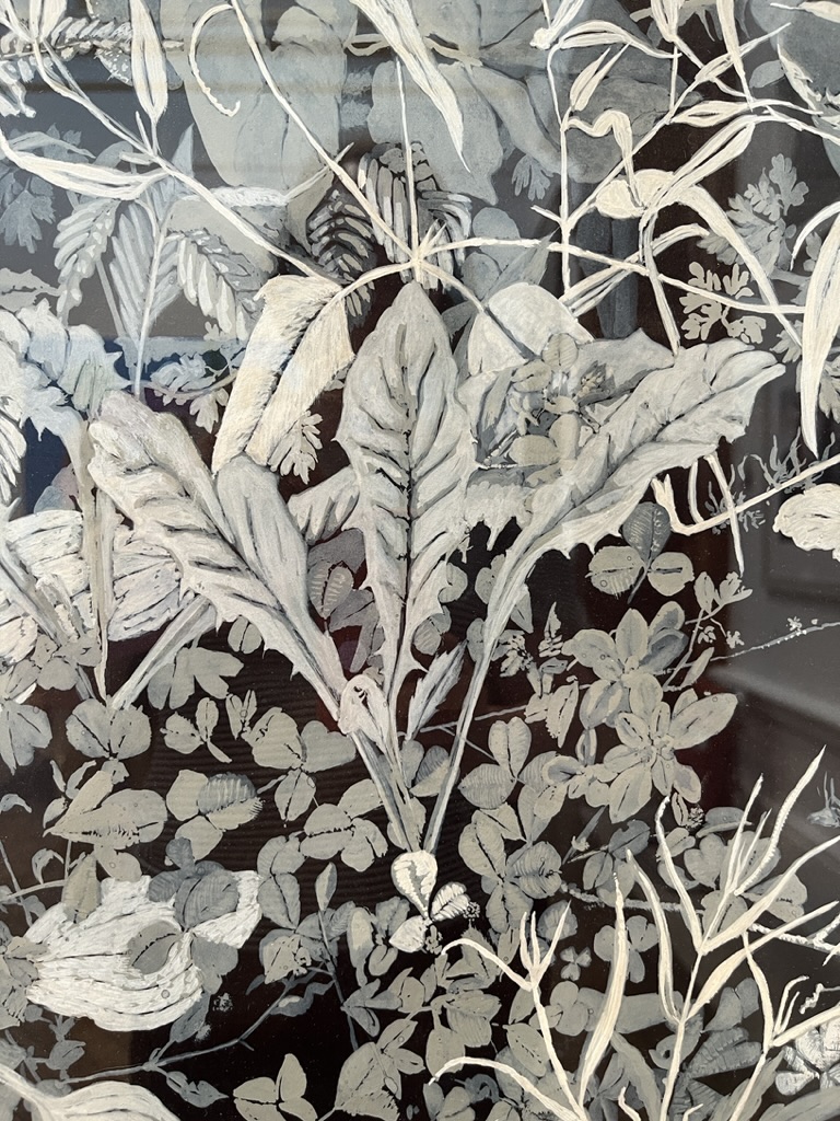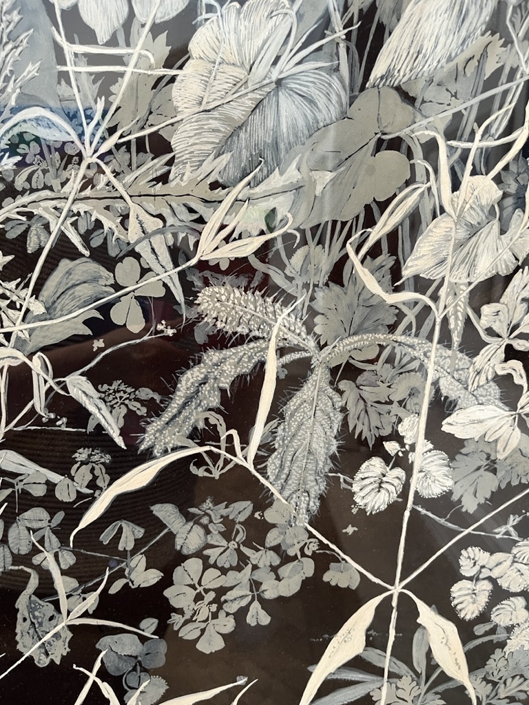 Can’t find a single thing out about this guy. So its just one piece of work to study for now but what a piece. Unfortunately my photo of the whole picture is blurred but you can see the level of detail from these 2 close-ups. What fantastic use of tone, a solid black background, gouache paint (my fave) and layering.