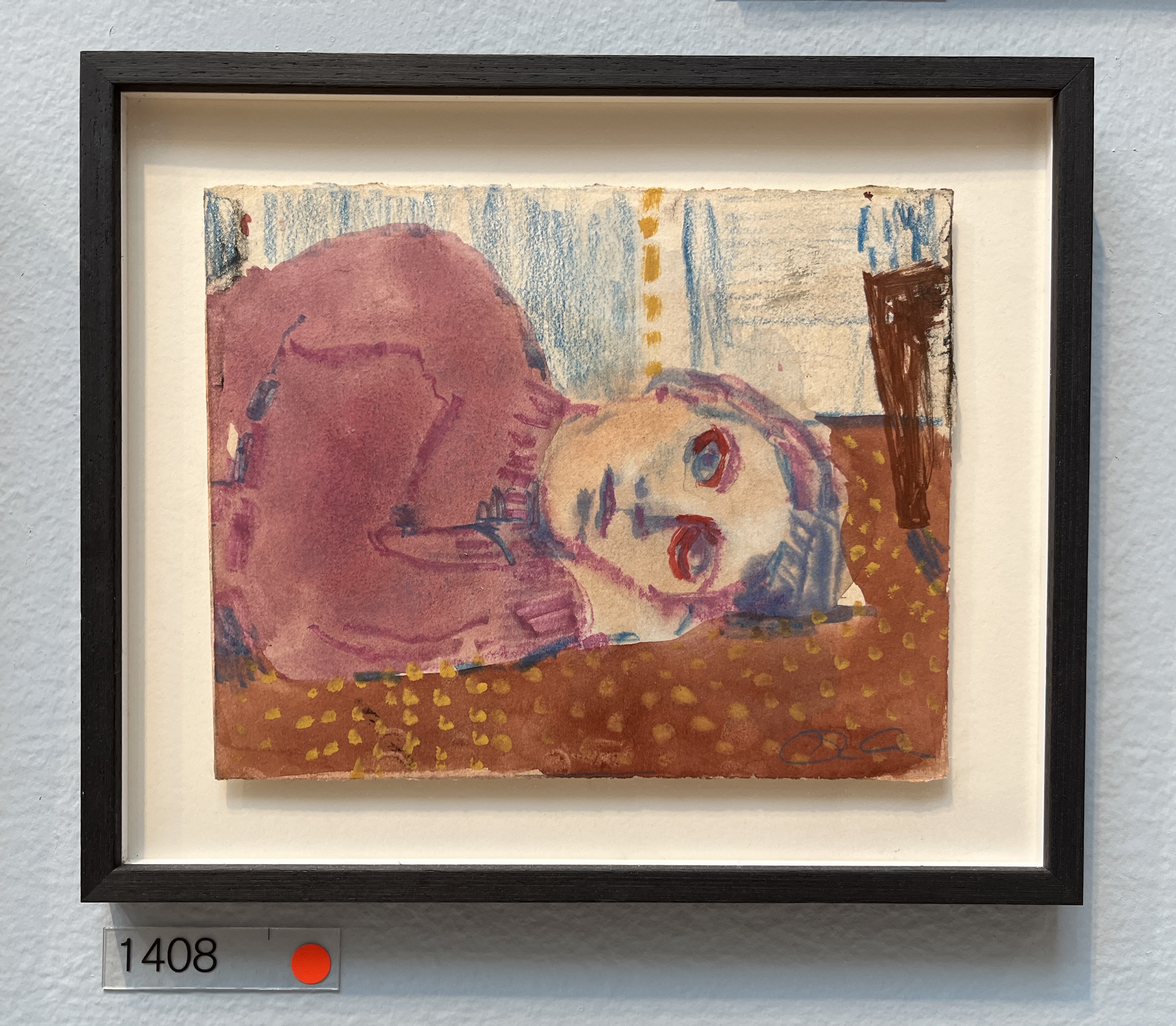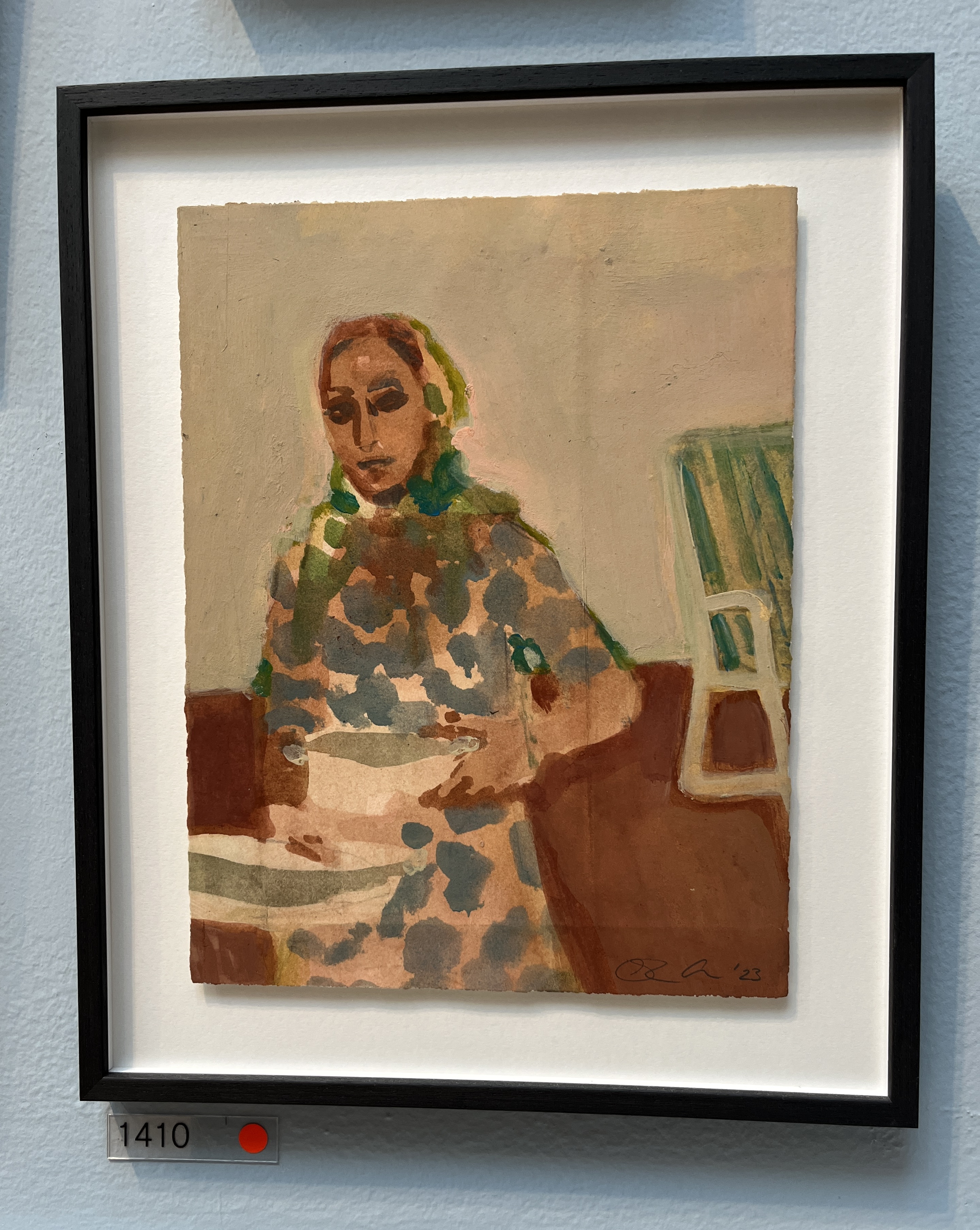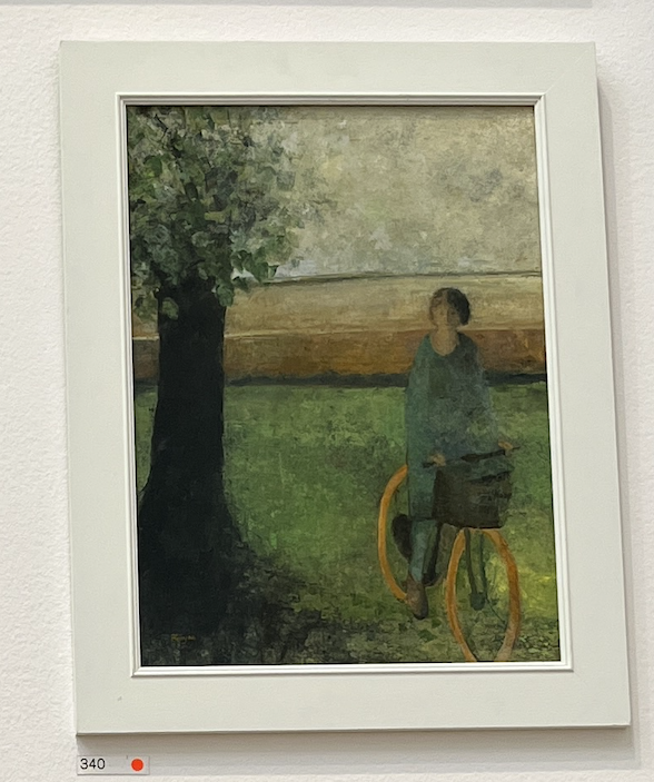 Another piece from the show that had quiet presence. Featured on a wall grouped with other complimentary (and interesting paintings) the mood of it pulled me in; the figure looking out to me (sad, happy, ok?) and the composition of horizontal background stripes and circular yellow wheels catch the eye after the mood has caught the heart.