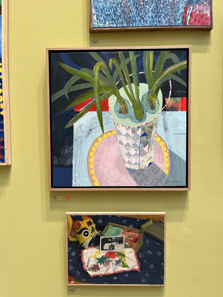 This delicious still life drew me across the room – that yellow scalloped shape, the aqua green next to that red stripe and the use of patterned paper collage paper. Some pieces of art make me just want to join in to and this was one. It conveys joy, play at work and inspired me to mix things up a bit by looking for simple shapes and complimentary colour pops.