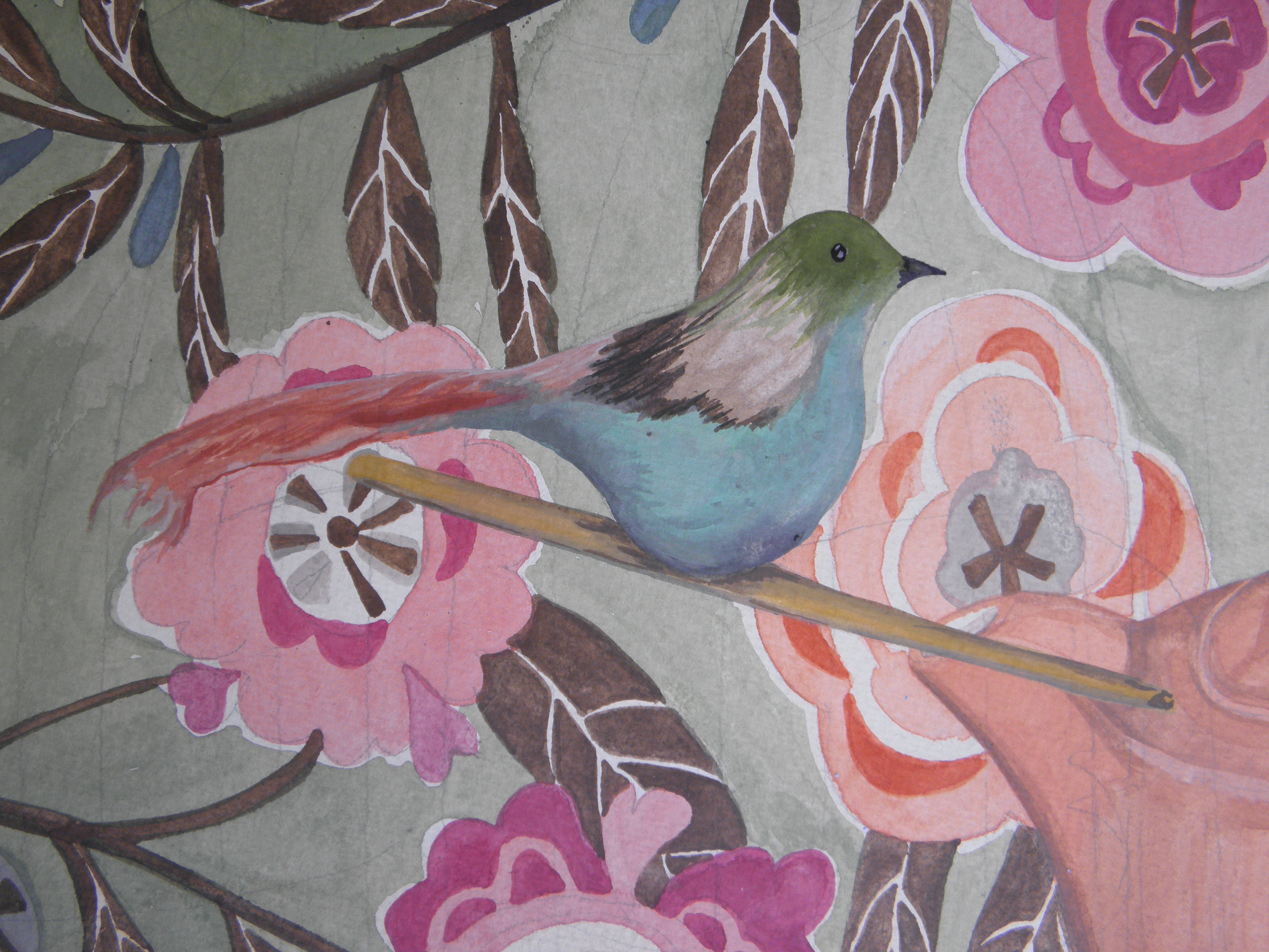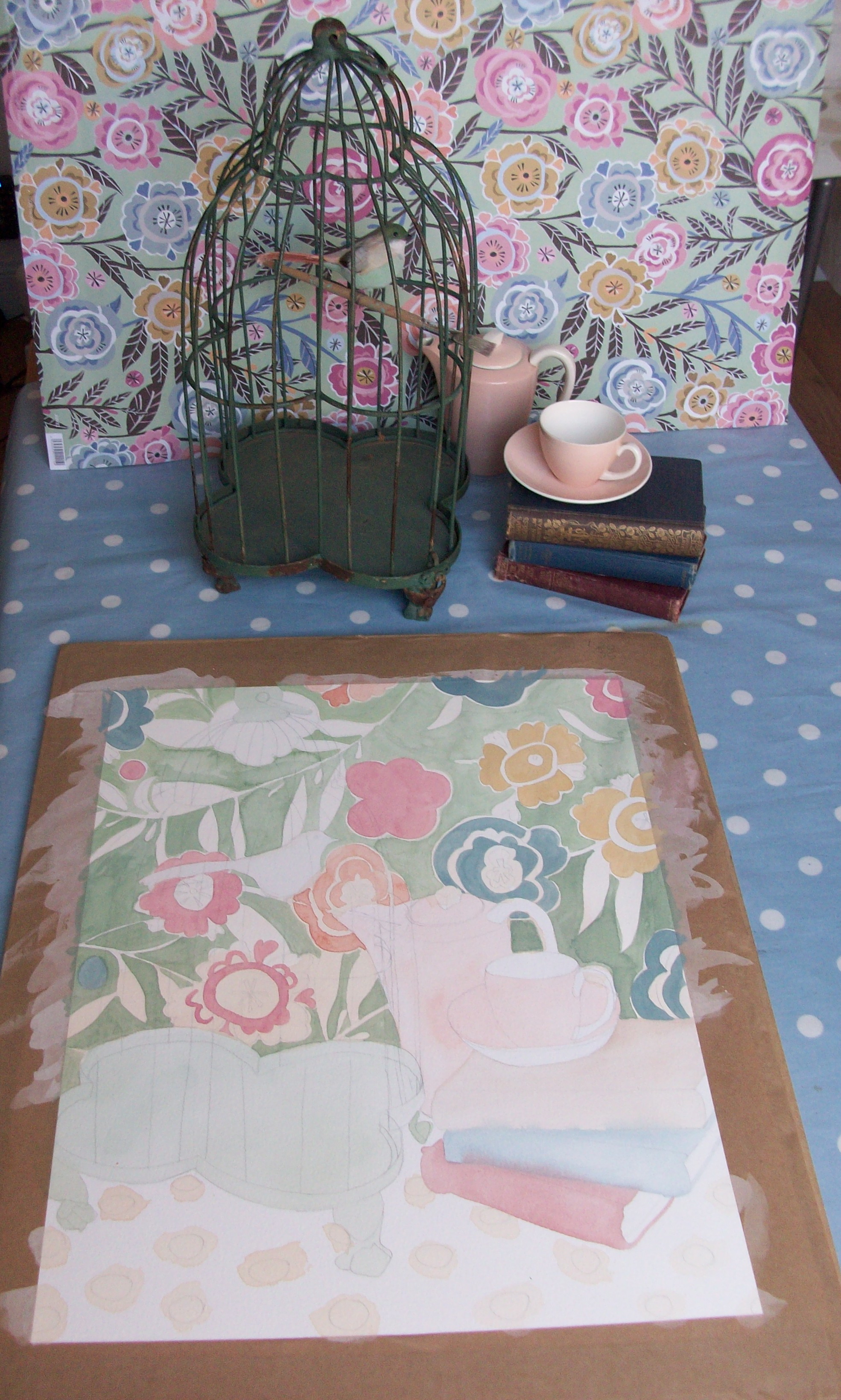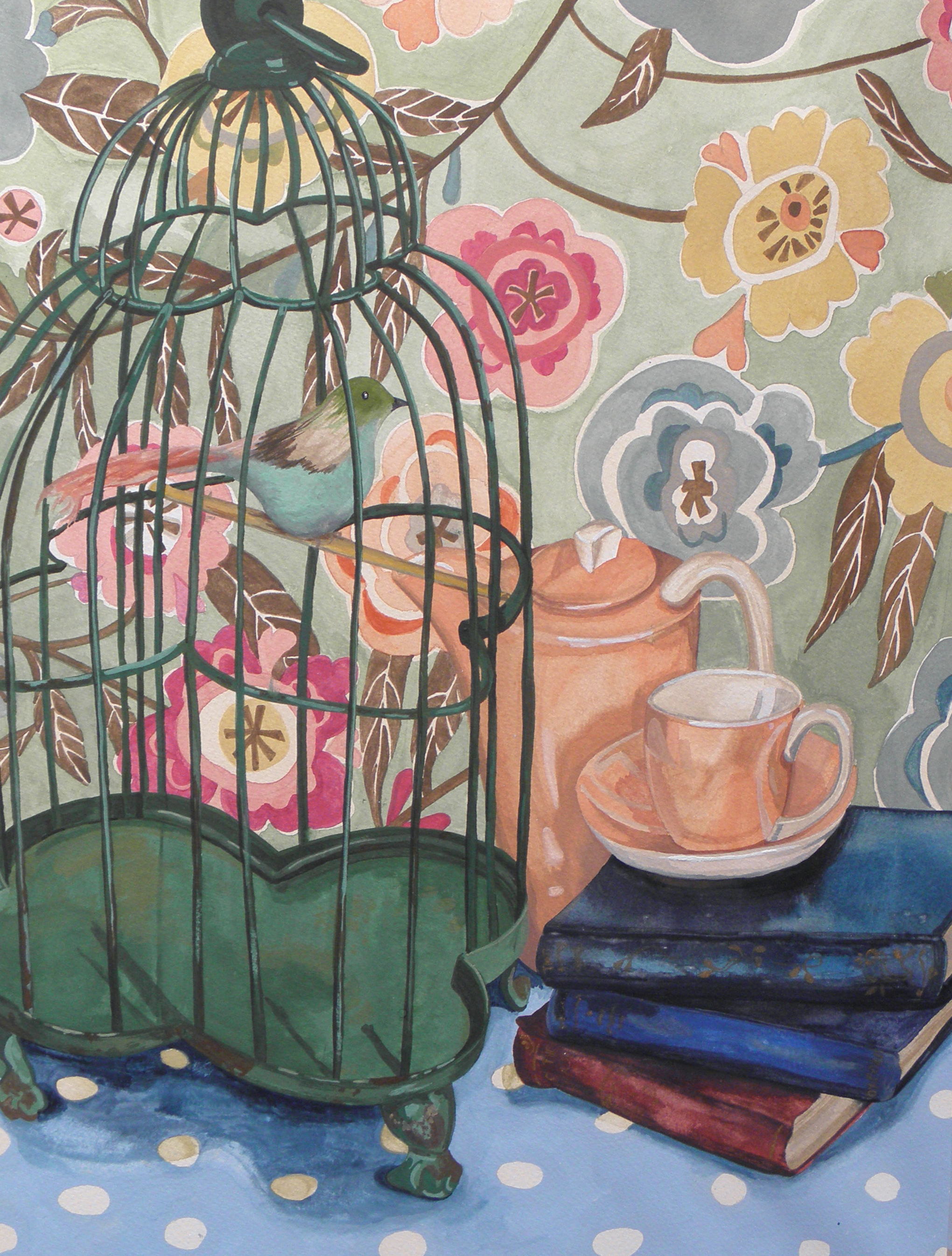 If I’d been able to write about this while I was in the process of working on it, then I surely would have complained about just how hard it was to get the birdcage in the correct shape and perspective. But as I couldn’t I can spare you the details of how pencil work became lost under a colour wash and then having to ‘guess’ in dark green paint like some kamikaze painter. Oops I think I just told you anyway…