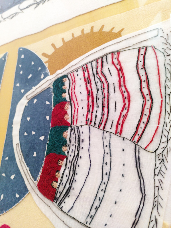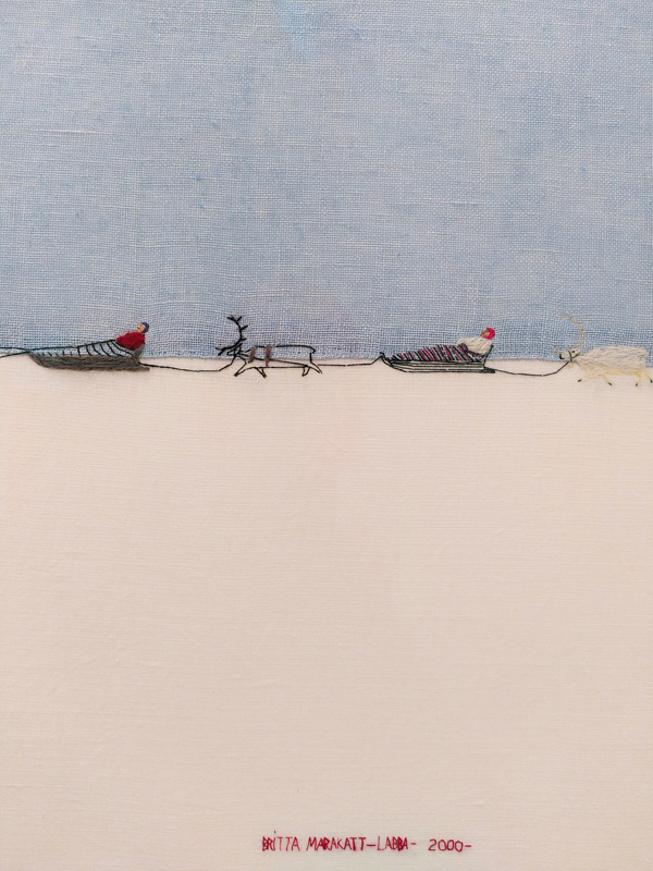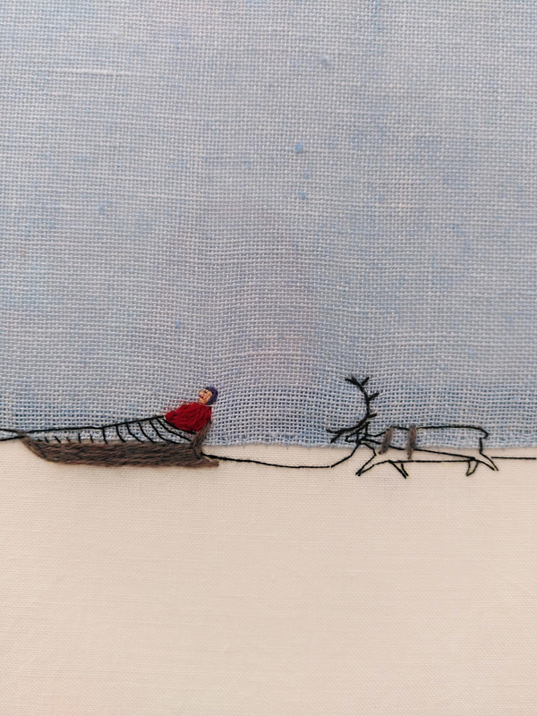 These pieces use stitches and thread (as line and pen) to illustrate and speak out against colonialism, environment issues and the loss of Sami indigenous lands and ways of life and Sami traditions.