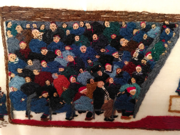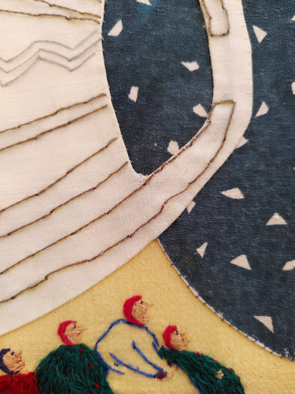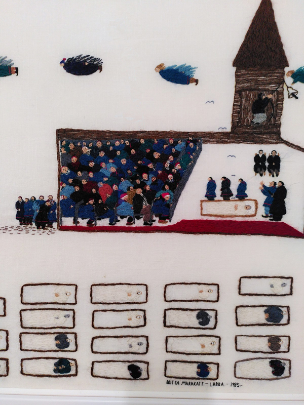Embroidery is not the first medium you’d maybe think to use for protest art but that is actually where the power in it lies – it catches you unsuspecting through its beautiful and gentle crafting but presents a clear and dissenting message against unfair state management and offences against Sami populations.