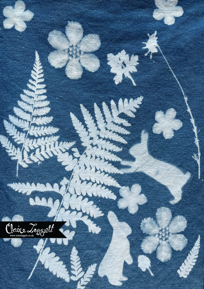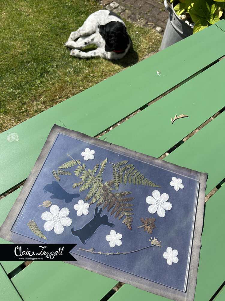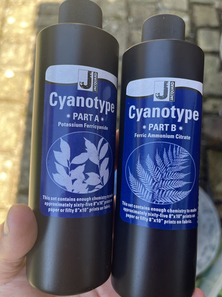 When the sun shines in the UK you have to make the most of it whichever way you like and for me today it was to use up the remaining half a bottle of Jacquard Cyanotype liquid for fabric and do some cyanotype printing.