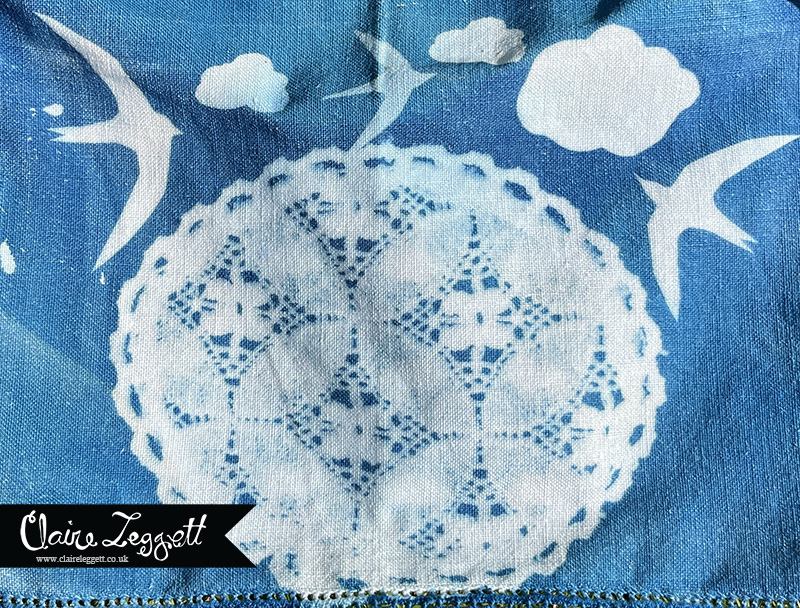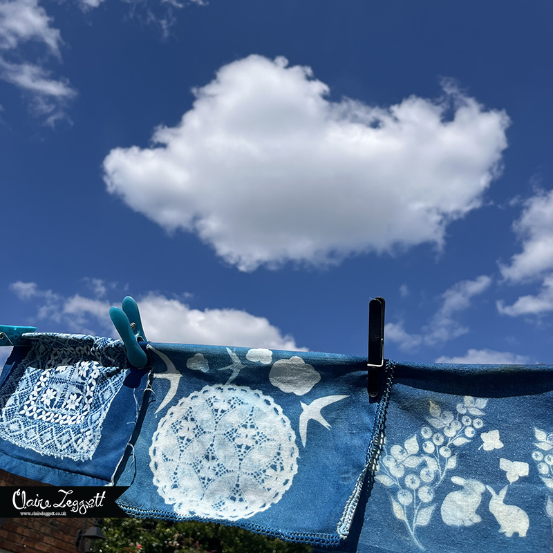 For full disclosure I did have 2 failures and both were caused by the wind gusting the acetate off the fabric into the air. This was solved by using the very heavy sheet of acetate which came in a paper cyanotype printing kit but I couldn’t use it for the larger pieces opting instead to hang around ready to pin it down if nec ! I also think a got a ‘less-blue’ result probably from it having been open for 2 years and from me eeking it out on the fabric when I painted it.