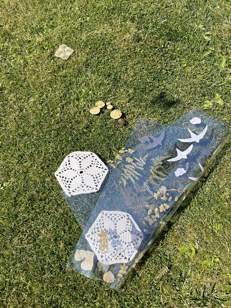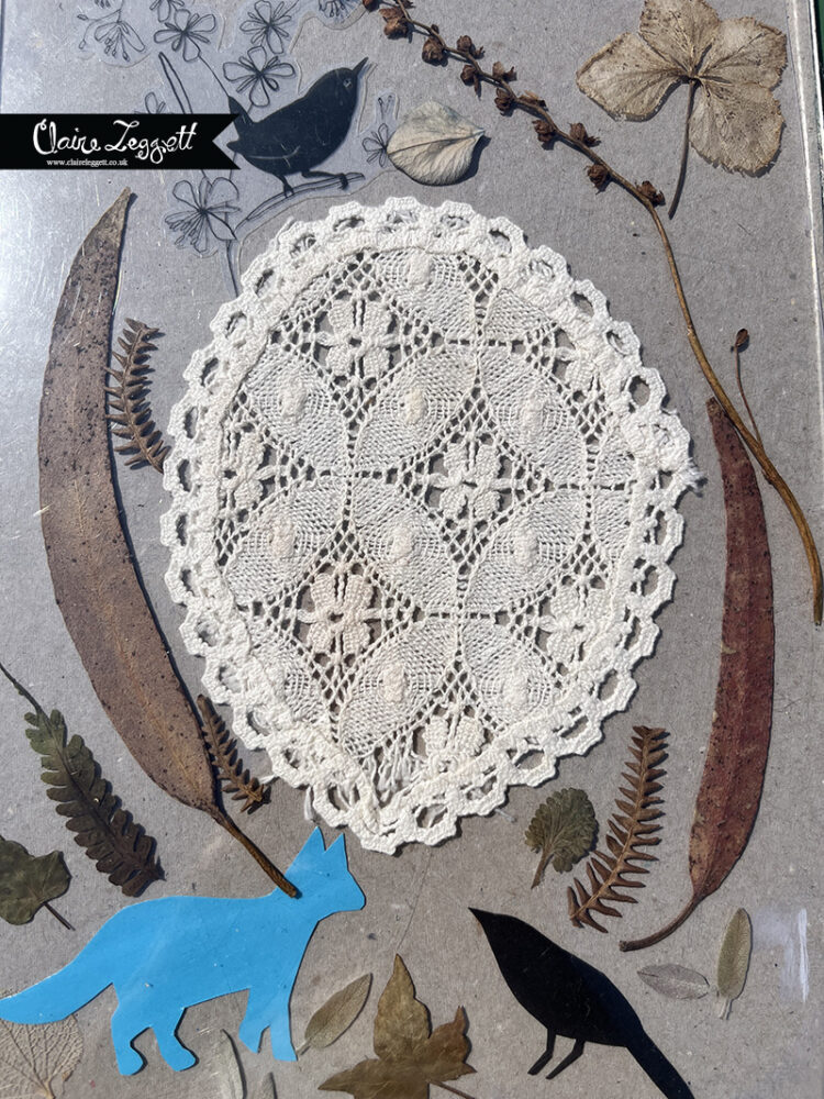 Another thing I like to use is dried things I’ve foraged or found but these are all best pressed and dried in advance. I included some of my design work which I had printed onto acetate to use especially. Vintage lace, crochet and pressed leaves all work really well too.