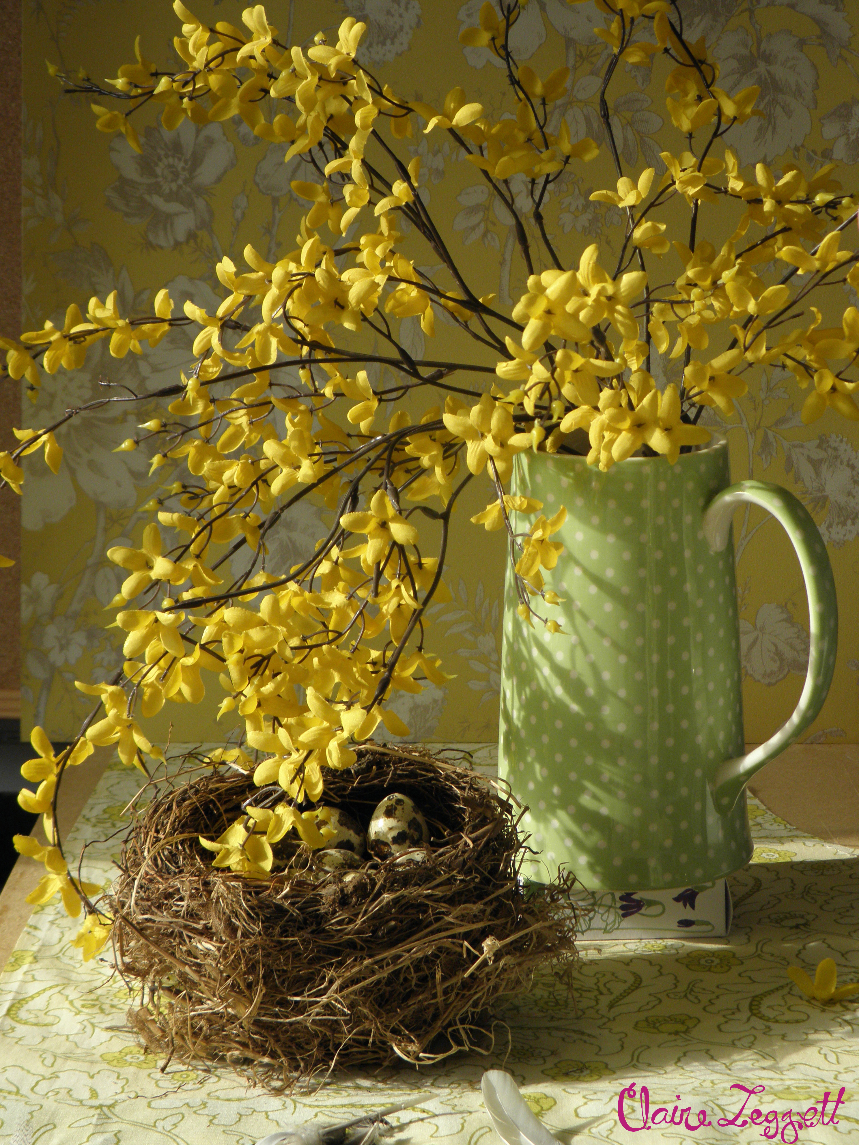 I have built a set up around the same vase but with three (of the most awfully tacky) pretend roses in it to help the composition. But it’s just not the same as the living thing. And because I wanted this piece of be about Spring I am having to use some faux Forsythia.