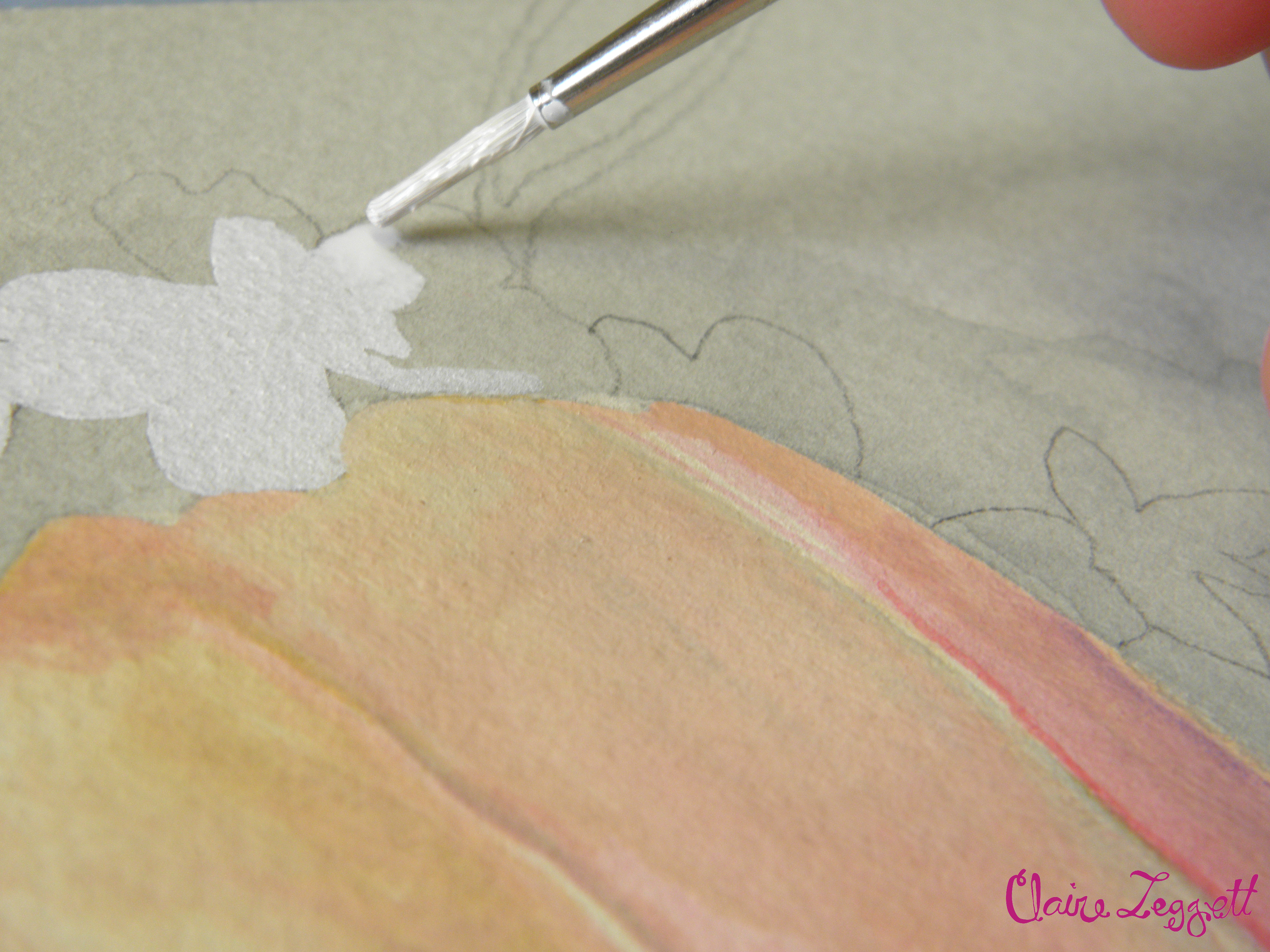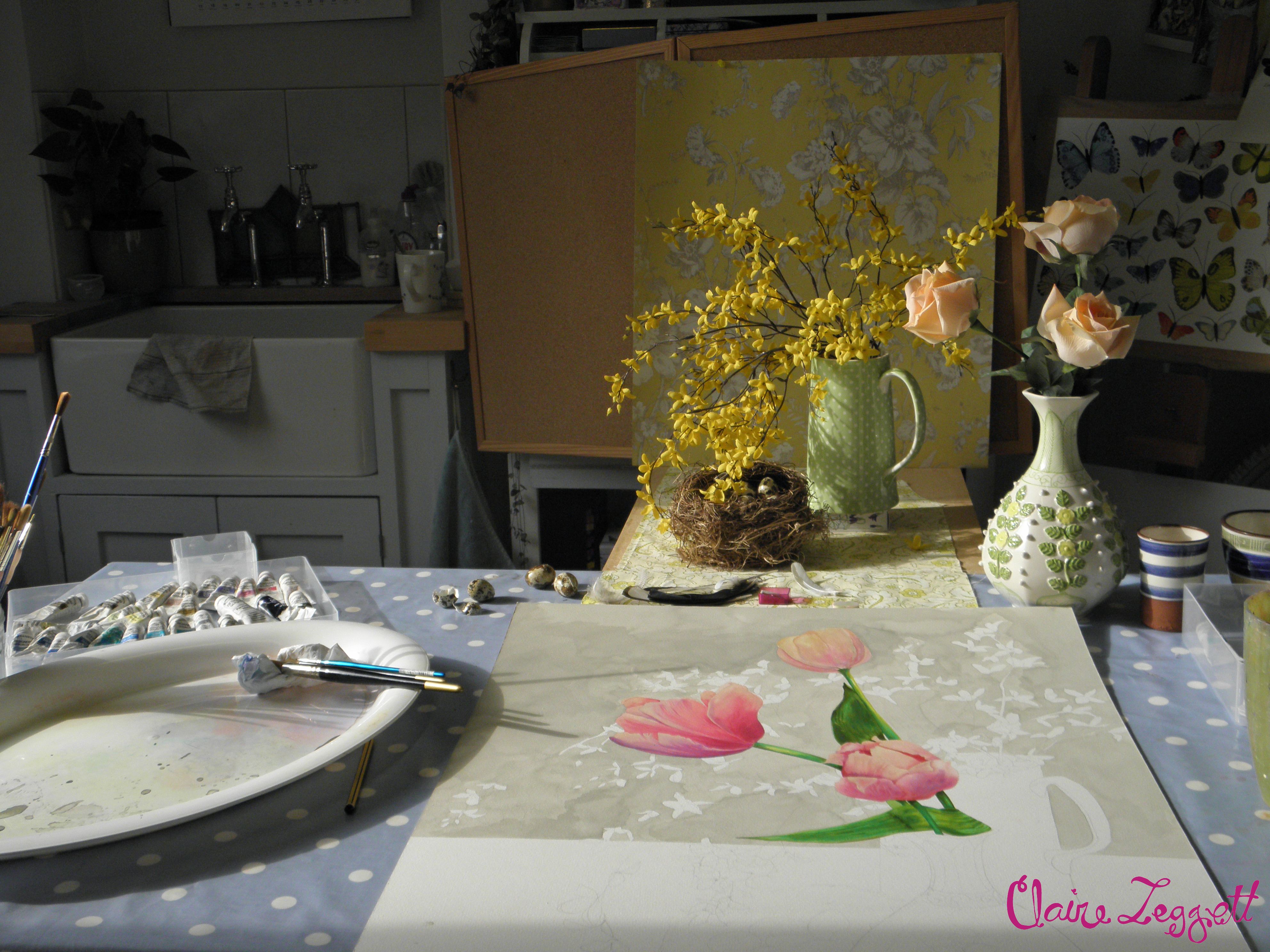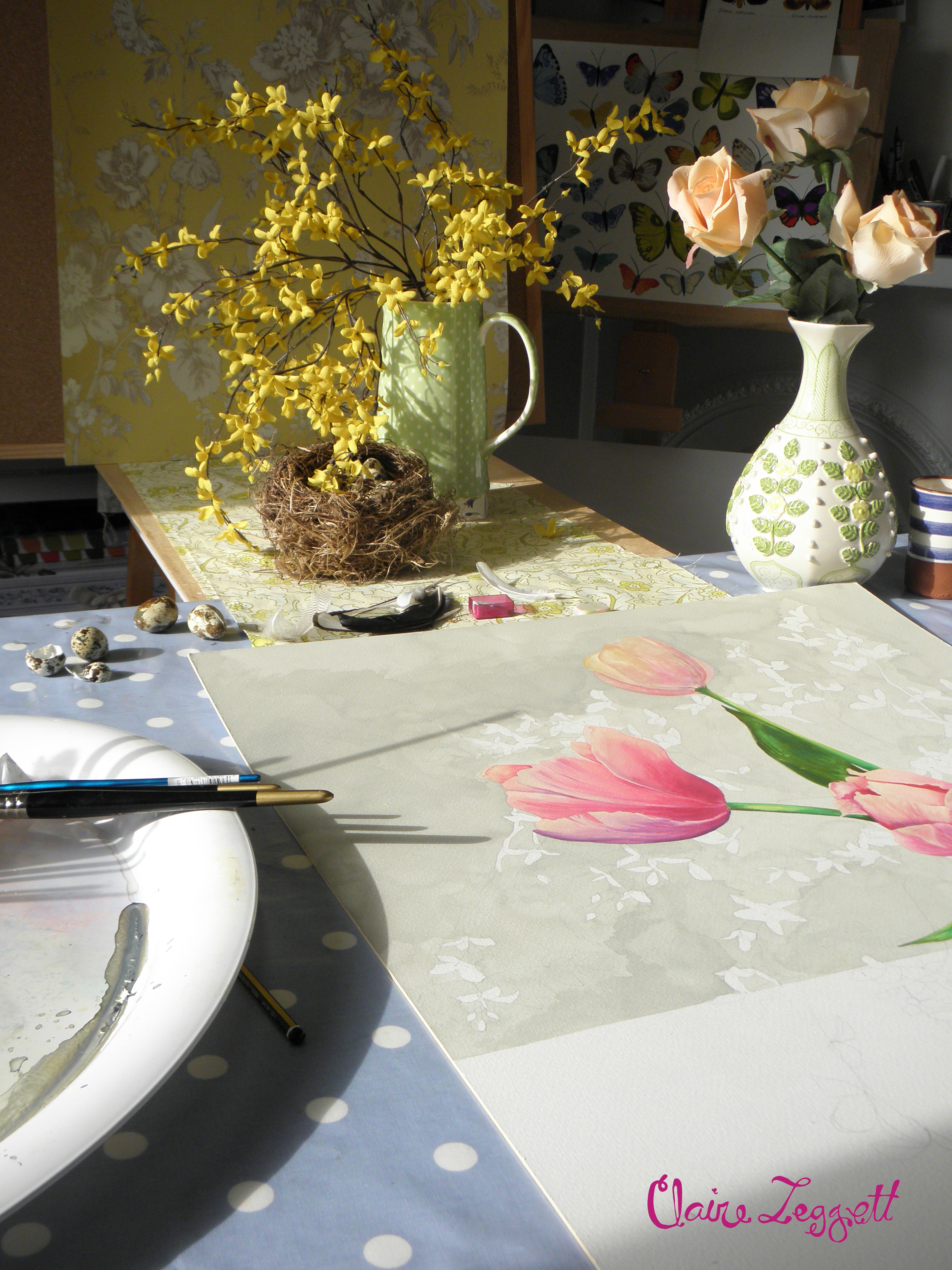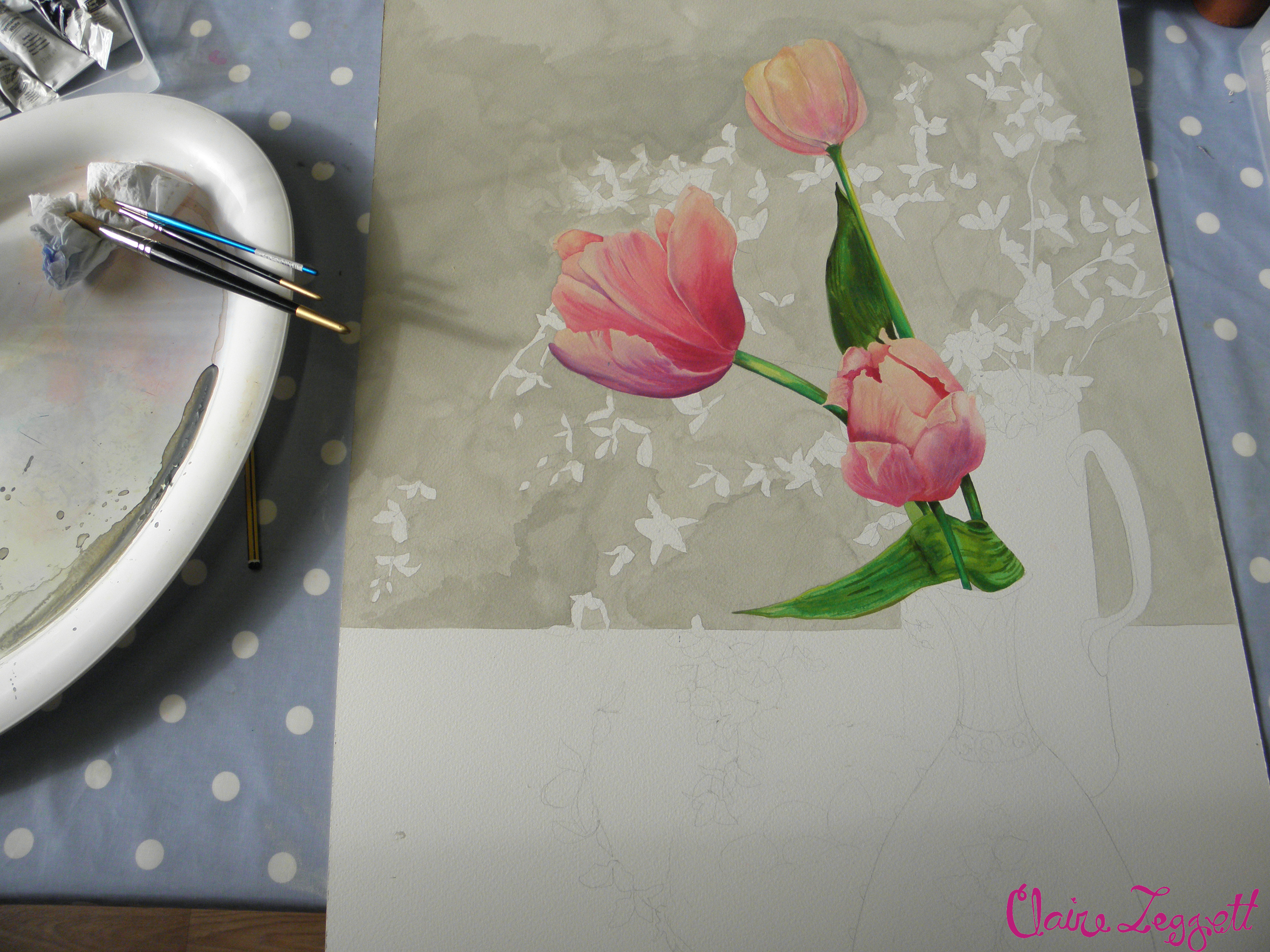 The painting around is driving me to distraction – I have coated the tulips in matt acrylic varnish to protect them but even so I have drawn it out, painted over it to wash the background and am concentrating so hard on not losing the pencil lines or paint on the tulips that I think I might just blow a gasket soon!