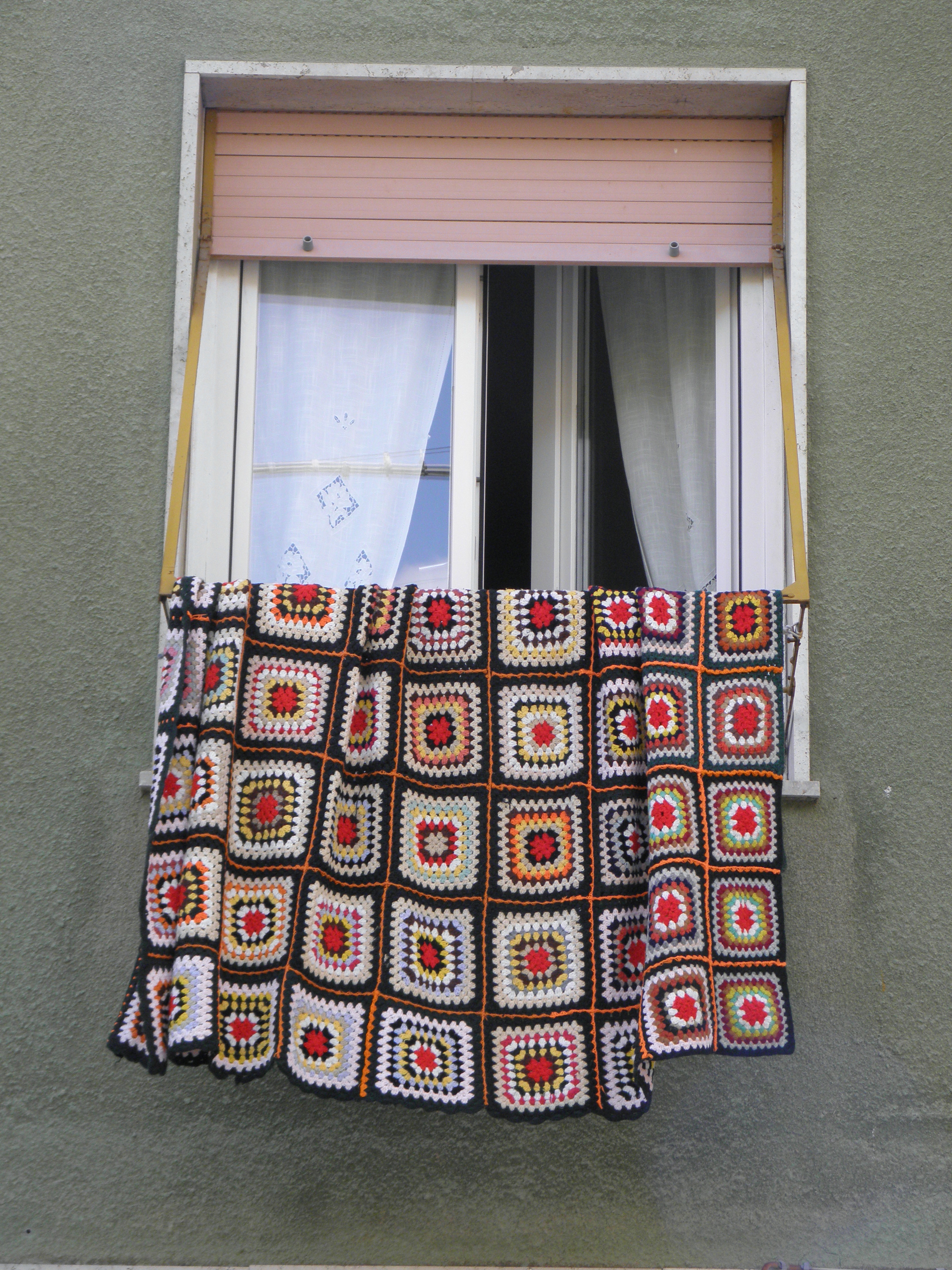 My heart skipped a beat on spying this crochet blanket hanging out to air (it was quite a few floors up or it might have been tempting – naughty!) But how splendid that the shutter and frame contrast so well with the yarn used – perfetto.