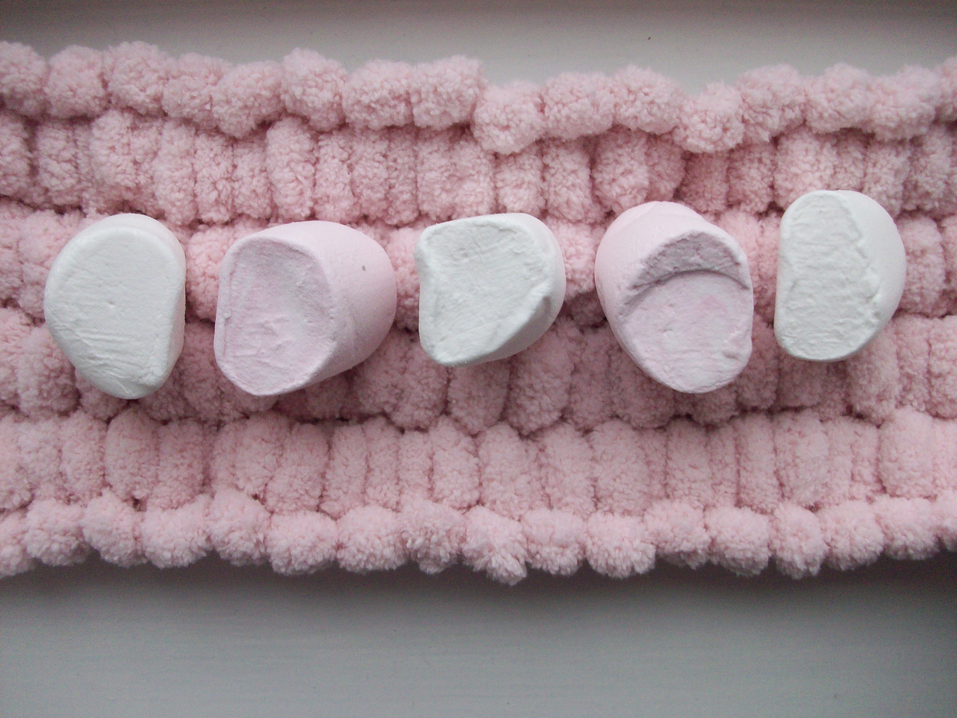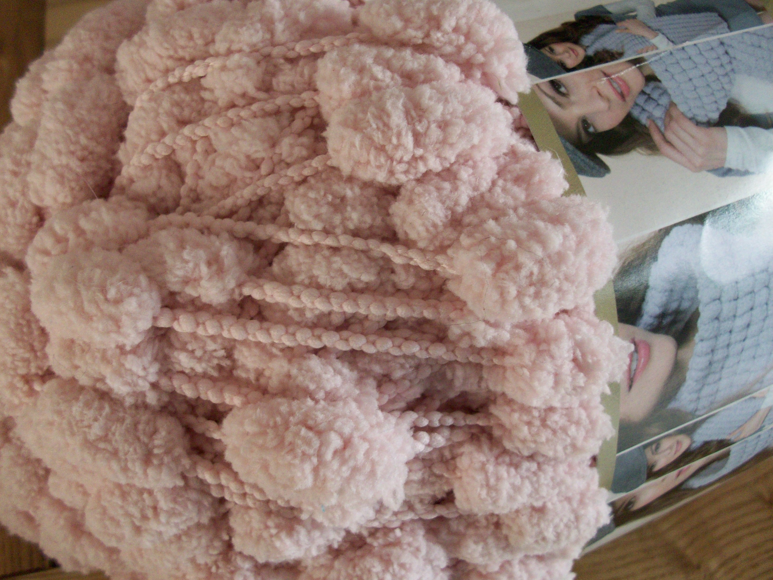 It took some adaptation to knit with because you fit two stitches between each pompom and because every time I looked at it my brain told my stomach I was hungry for marshmallows!