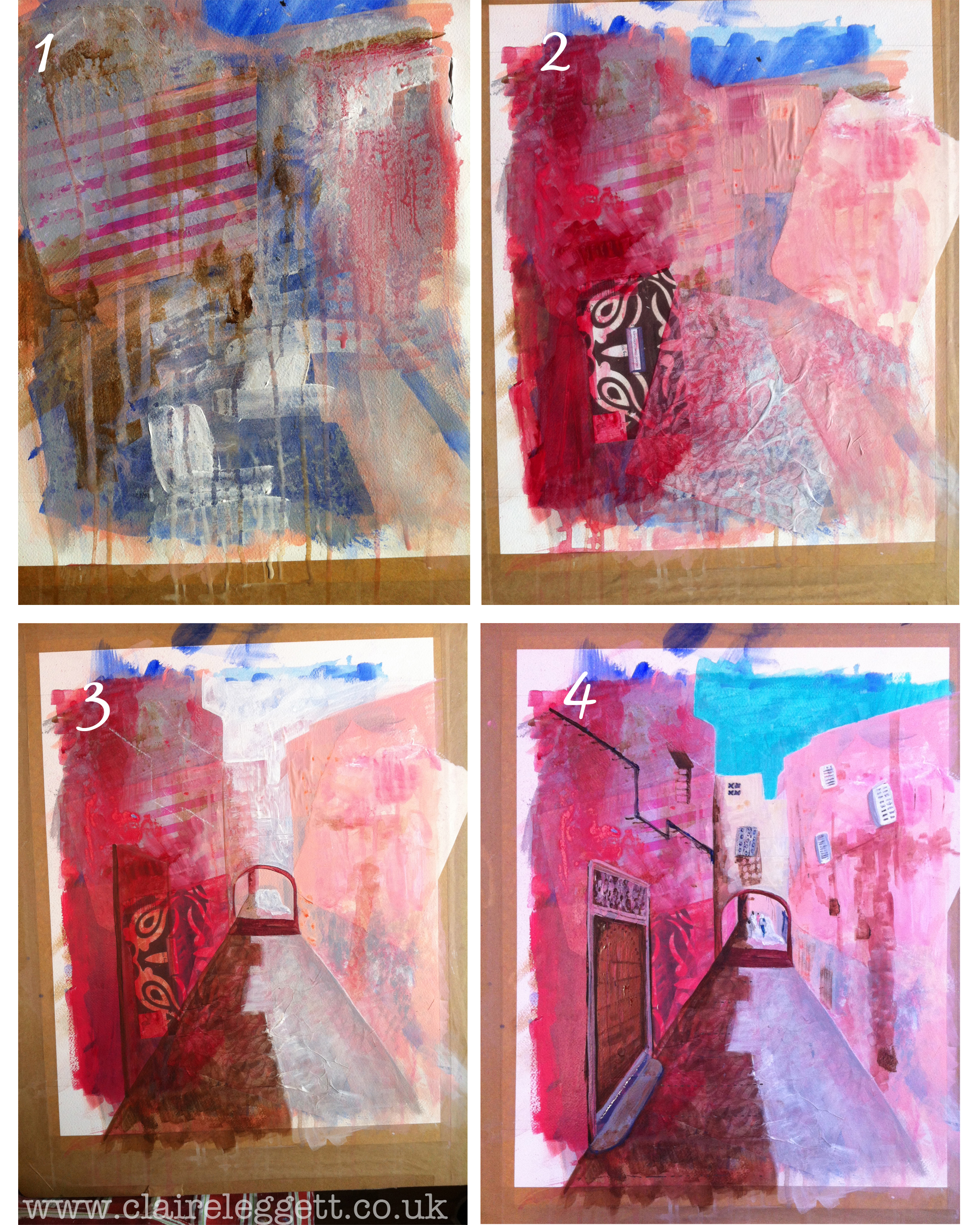I started a piece on a blue painted acrylic background and then added the first layer of gouache paint. But by the end of day one something was nagging me. Turned out to be the composition, which meant that a lot of the painting was given over to a not very interesting wall to look at. That’s when Mike Bernard’s influence kicked in.