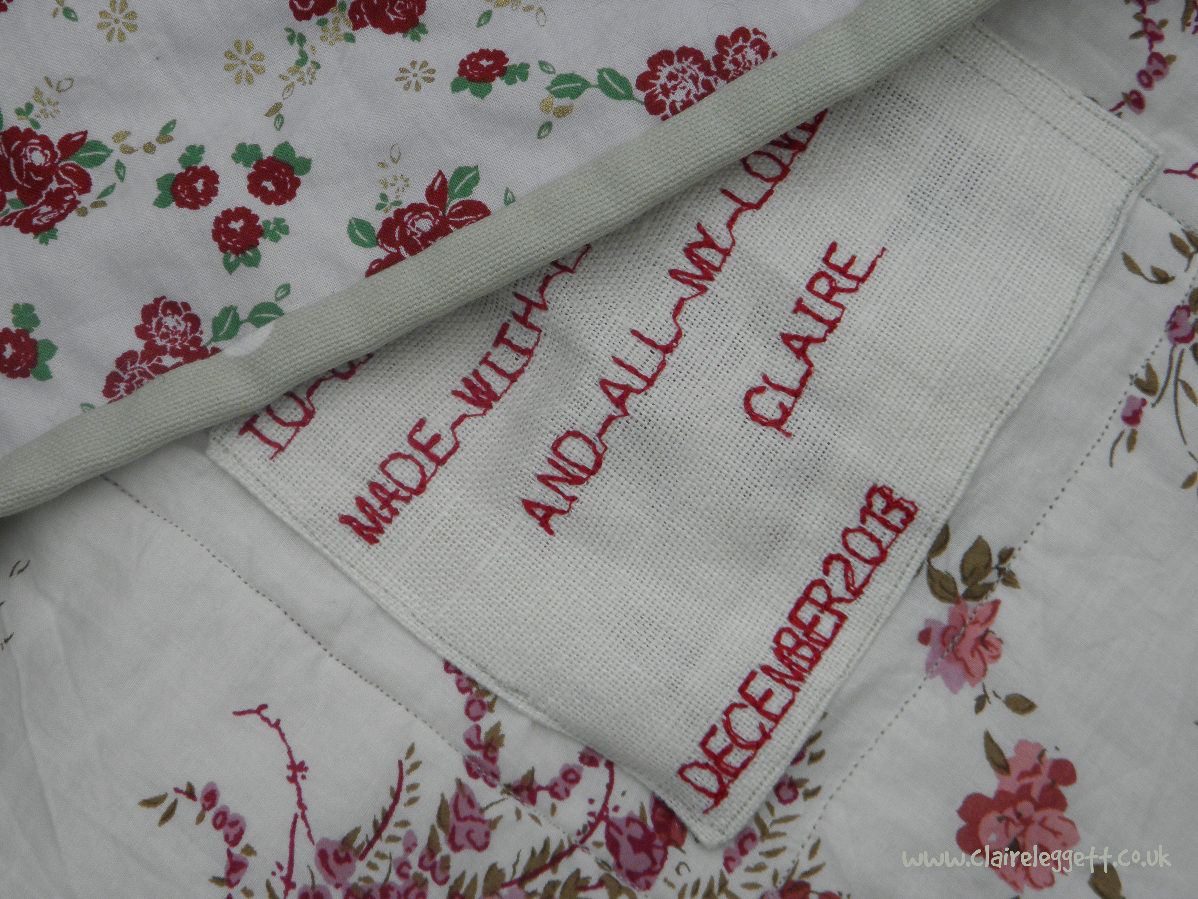 I believe it’s quilters etiquette to name and date your creations these days. My friend Abs has a fancy sewing machine that stitches words and she kindly made me some labels to stitch on the back as the thought of all that hand stitching was a bridge too far!