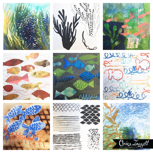 5 May 2017Angela, this one is just for you 🙂 Thanks for asking 😉 Some more snippets from the pages of my Fish Sketchbook (see previous post) showing bits of pattern exploration, a little painting, rust dying, block printing, collage, string printing, applique and free motion embroidery.