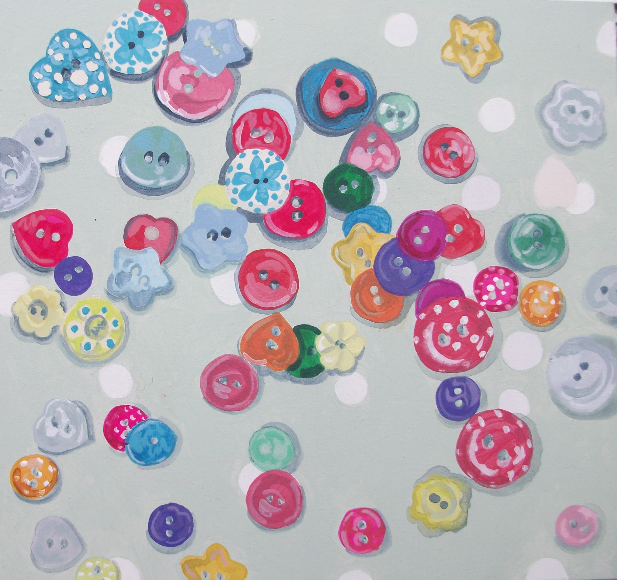 Buttons is a real fave of mine from back in 2010; acrylic painting on an MDF board measuring 21.5 cm x 20 cm, un-mounted, unframed. It will be selling at £35 plus P&P – UK £3.20, USA etc £7.45 SOLD