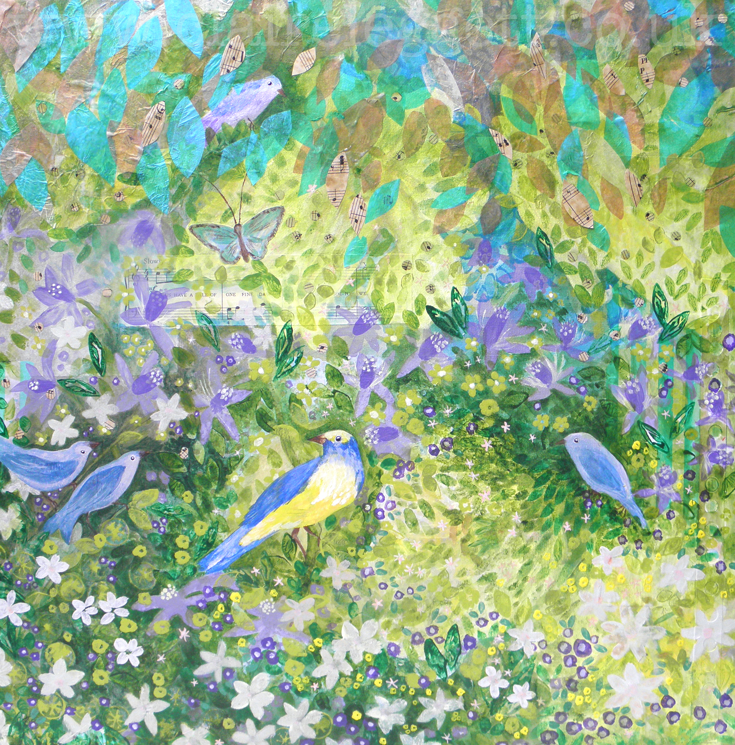 Little Birds is a much bigger acrylic mixed media piece painted over collaged scraps on a canvas measuring 50cm x 50cm, un-mounted, unframed. It will be selling at £127 plus P&P – UK delivery only @ £11.99.