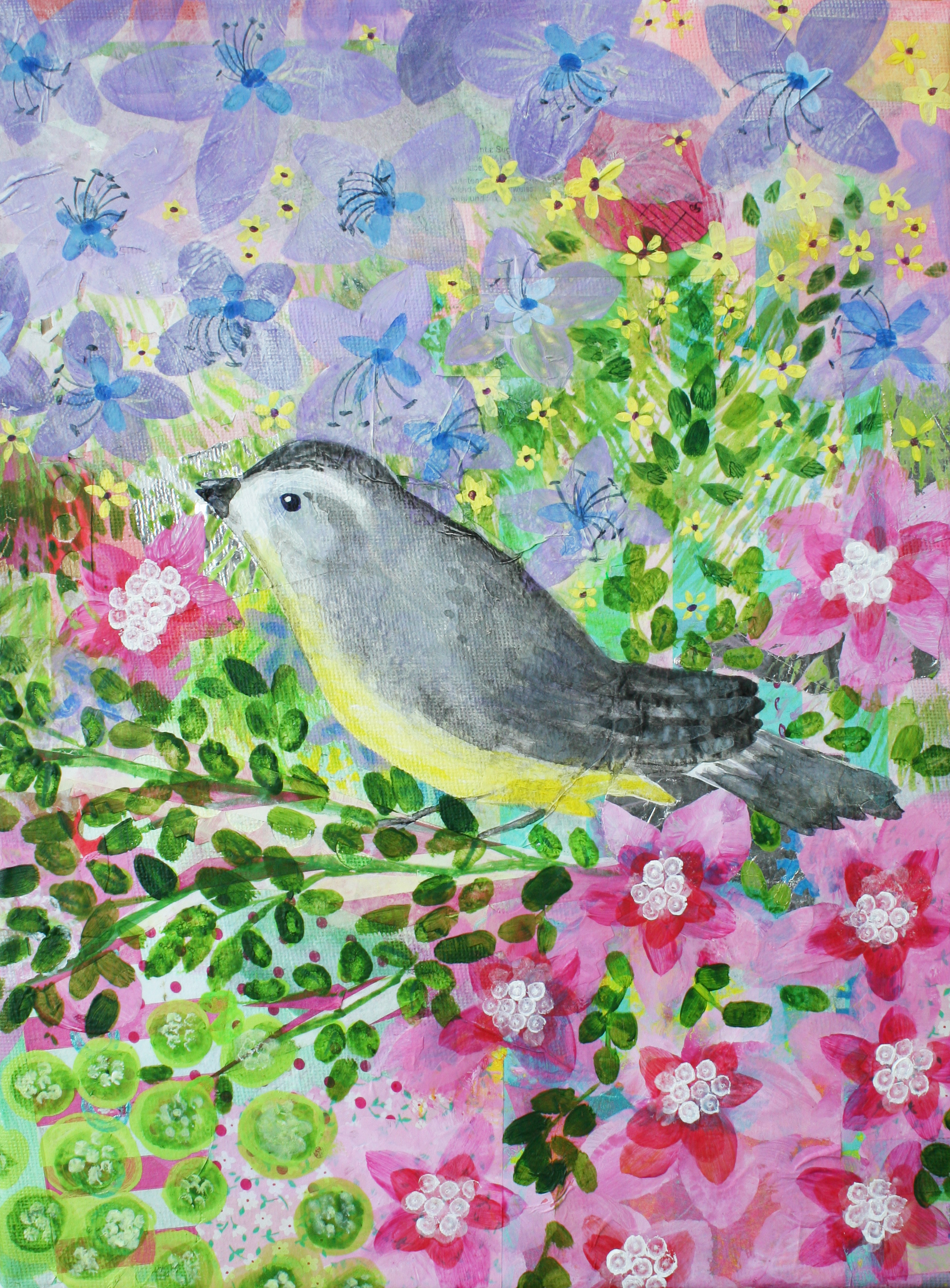 Wagtail is an acrylic mixed media piece painted over collaged scraps on a canvas measuring 23cm x 31cm, un-mounted, unframed. It will be selling at £50 plus P&P – UK £3.20, USA etc £7.45 SOLD
