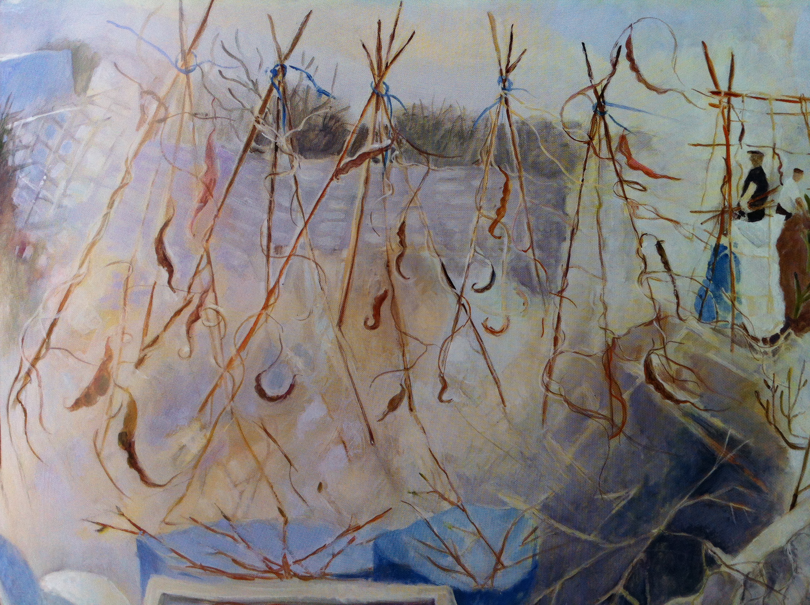 She would visit local allotments in Suffolk to sketch and observe and then return to her studio and paint – usually oil on board or wood. I love the very English colour palette that she captures where the colours that would stand out in reality, like a blue plastic water-butt or an orange piece of netting, still have muted tones to them amongst the greens and greys of the English sky and natures foliage.