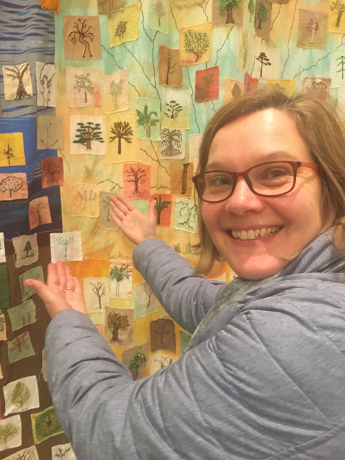 Our stitched tress were collected and stitched together to make a forest as a symbol of support and togetherness for all displaced people around the world. It’s just a photo here but it has a big impact in real life. It makes a statement and in the under-stated way that only fabric, textiles can because it appears so domestic and unthreatening but then you consider the strength of it’s message.