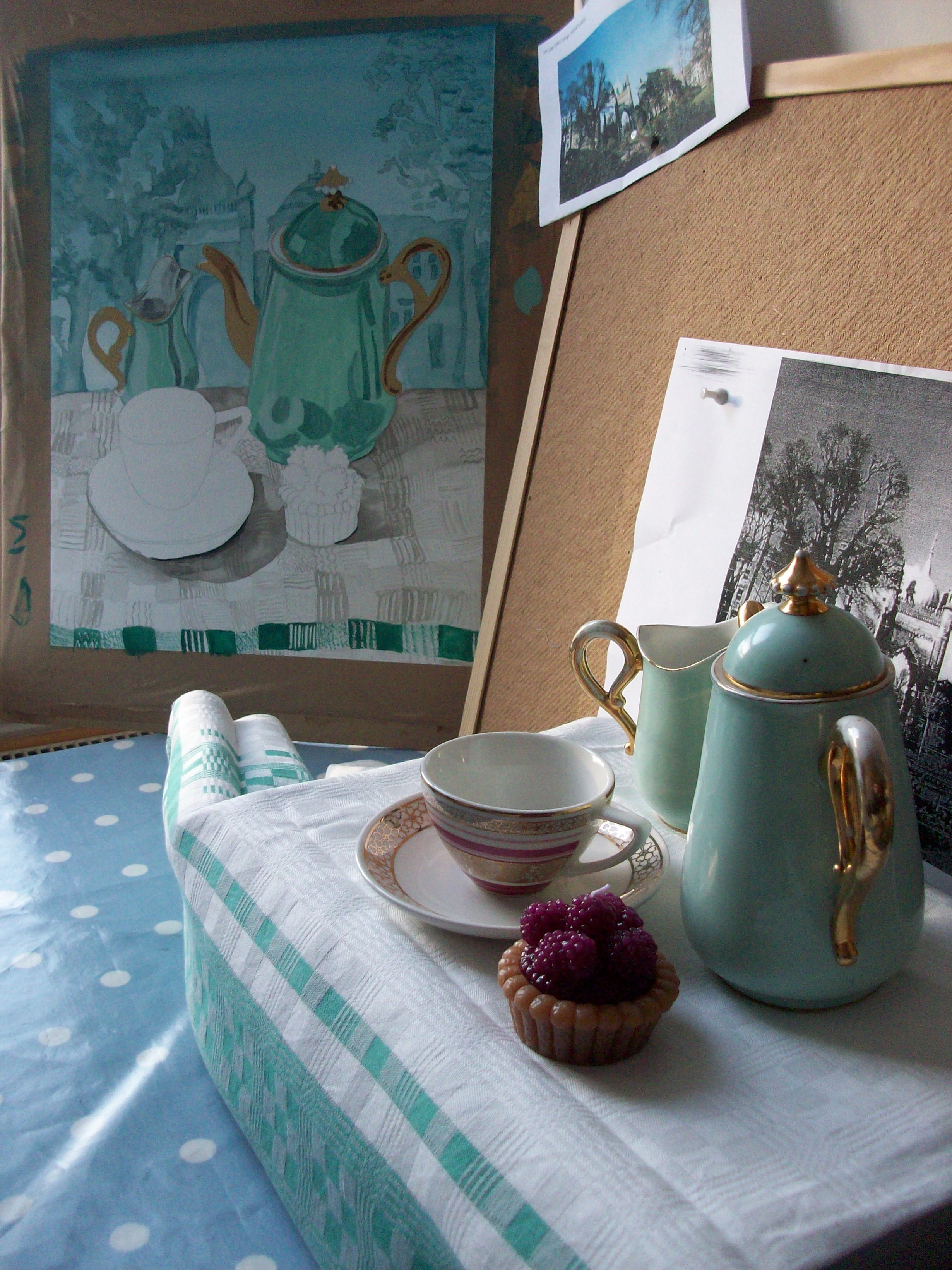 Today has been hard work trying to corral this painting into fine form. I know many painters choose favourite objects to paint again and again. For me today has been a day of not wanting to paint certain objects again!! For example; I love this teacup but I always seem to struggle to translate its shape onto paper and it comes out wonky! And I adore the teapot and jug but that green is a killer to mix tones and tints for. Finally as it started to come together layer by layer, it was apparent to me that I’d been very ‘green’ painting the background wash in a green tone with green china in front. Doh! Maybe a glass of wine, an episode of Glee and a good night’s sleep will bring the fresh touch needed for tomorrow. Have a good evening too.