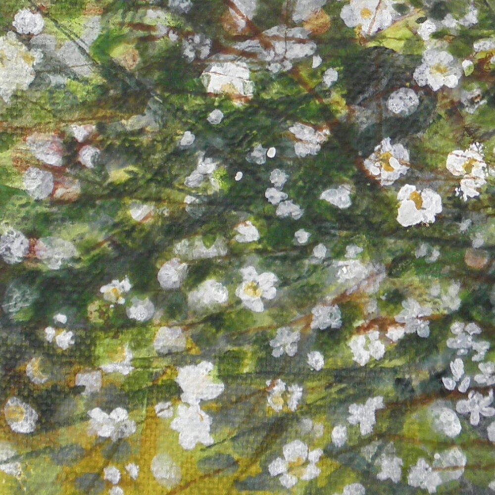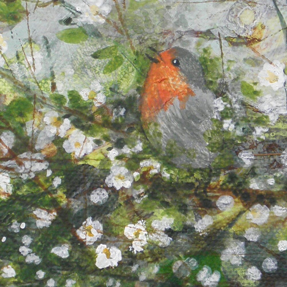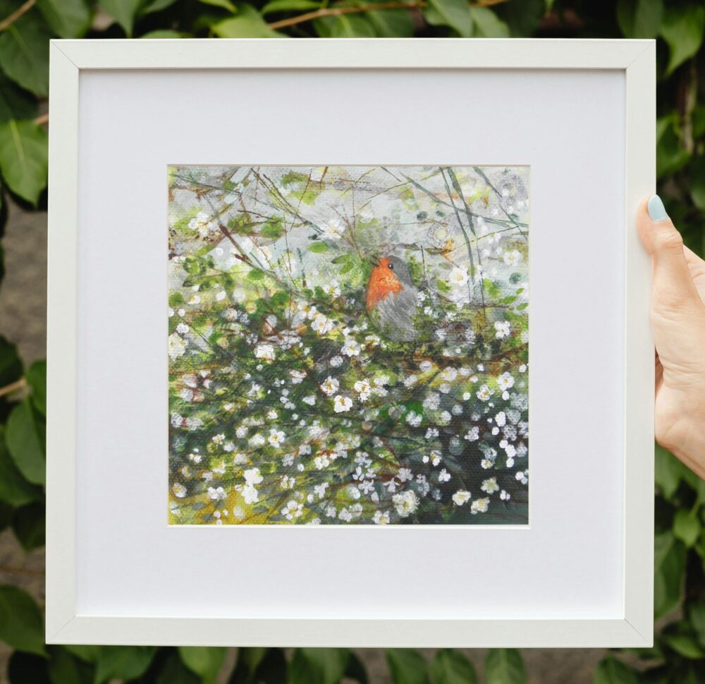 Robin is an original acrylic painting on a stretched canvas. I don’t usually favour acrylic paint but occasionally it lends itself nicely to layering up textures, which this piece called for. During my Artist in Residency at University of Birmingham, Winterbourne House & Gardens I was accompanied one day by this Robin as I sat drawing the Japonica blossoms.