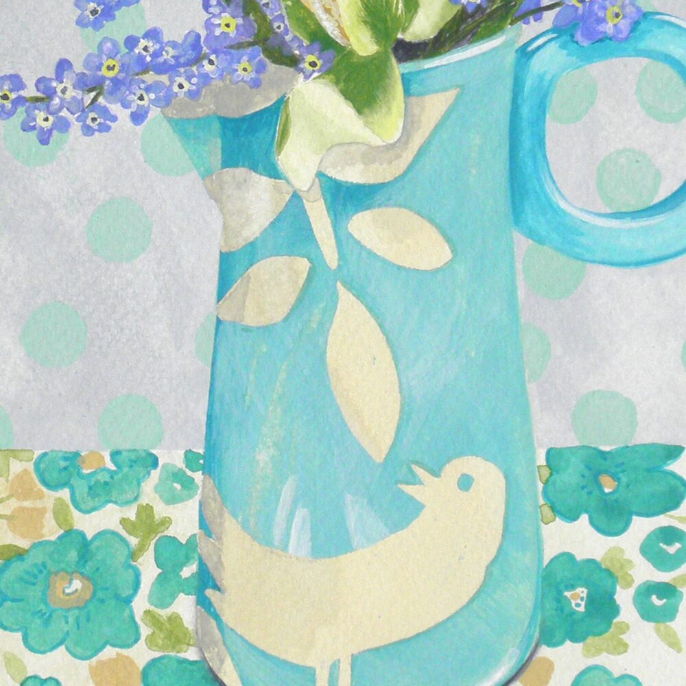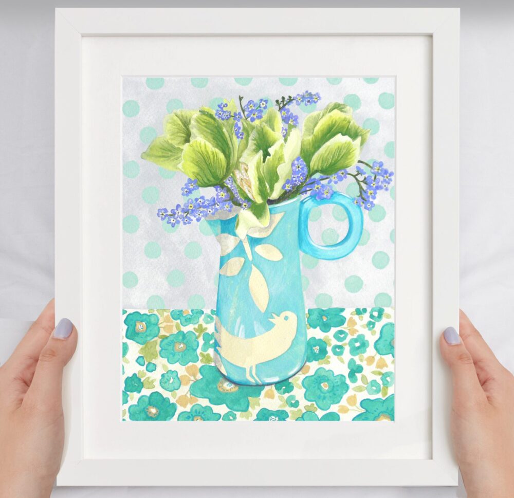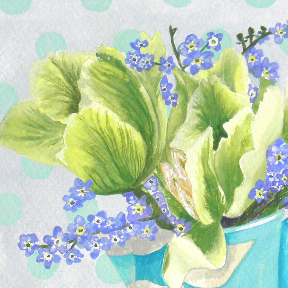 I love to paint what I can grow in my garden – this lime green and ivory tulip inspired a fresh, Spring-time still life executed in gouache watercolours on watercolour paper.