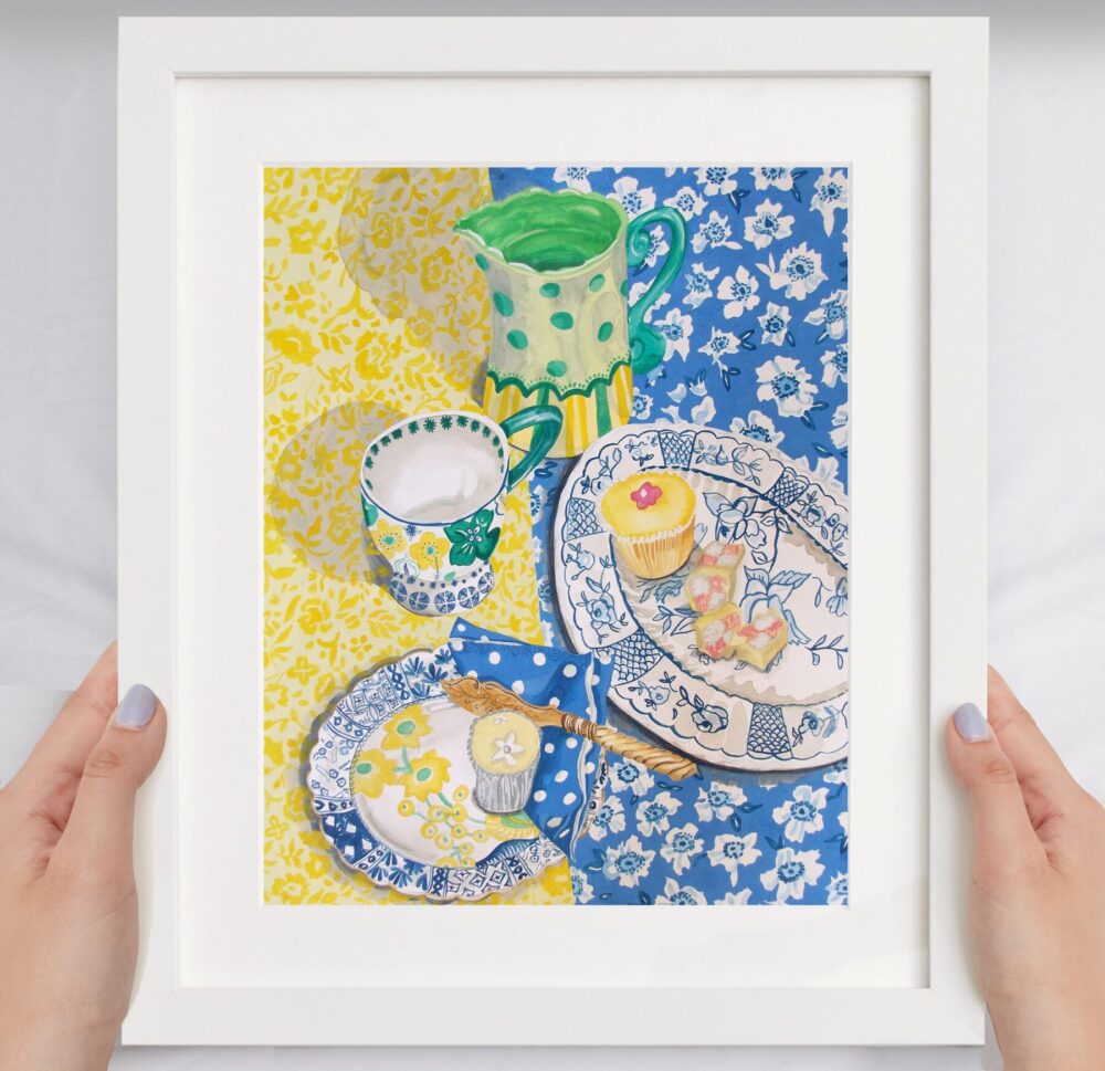 Tea Table is part of a series of paintings looking at Tablescapes and developing unusual compositions. This still life was set up on the floor so I could look down onto it as I painted. The juxtaposed yellow and blue fabrics provide a strong leading line for the eye through the painting and provide a playful way to alternate and contrast the yellow and blue objects making for a balanced but interesting composition.